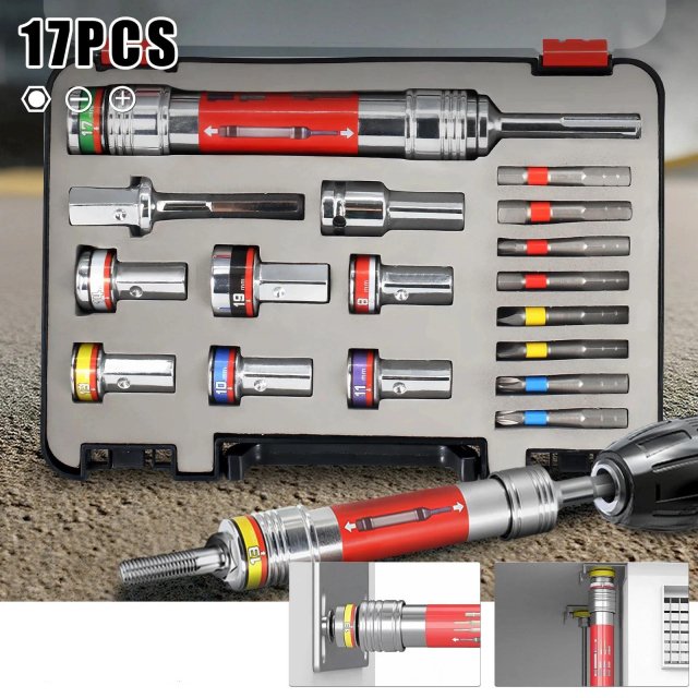 Take your DIY and professional projects to the next level with this 17-piece multi-purpose quick-change hex socket set. Designed for hammer drills, electric drills, and power wrenches, this all-in-one kit combines strength, versatility, and ease of use. Whether you are tightening bolts, assembling furniture, or working on automotive repairs, this set is built to make every task faster and smoother.