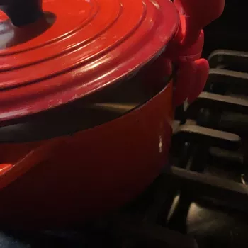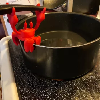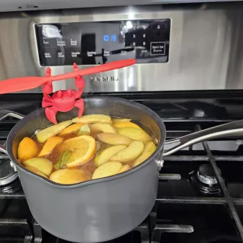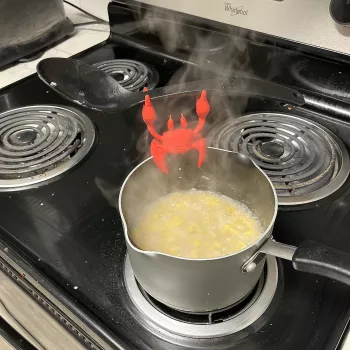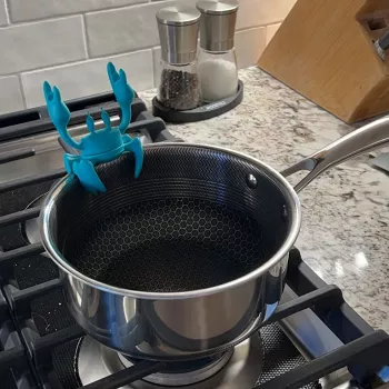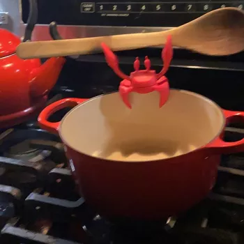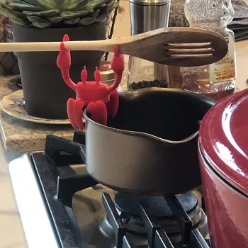 This little red crab is both the cutest and one of the most useful items on my stove. It holds spoons and lids partially open, making it a great kitchen addition.