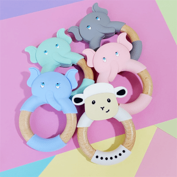 Cartoon Elephant Silicone Baby Teether with Beech Wood Ring – BPA Free, Safe Infant Toy
